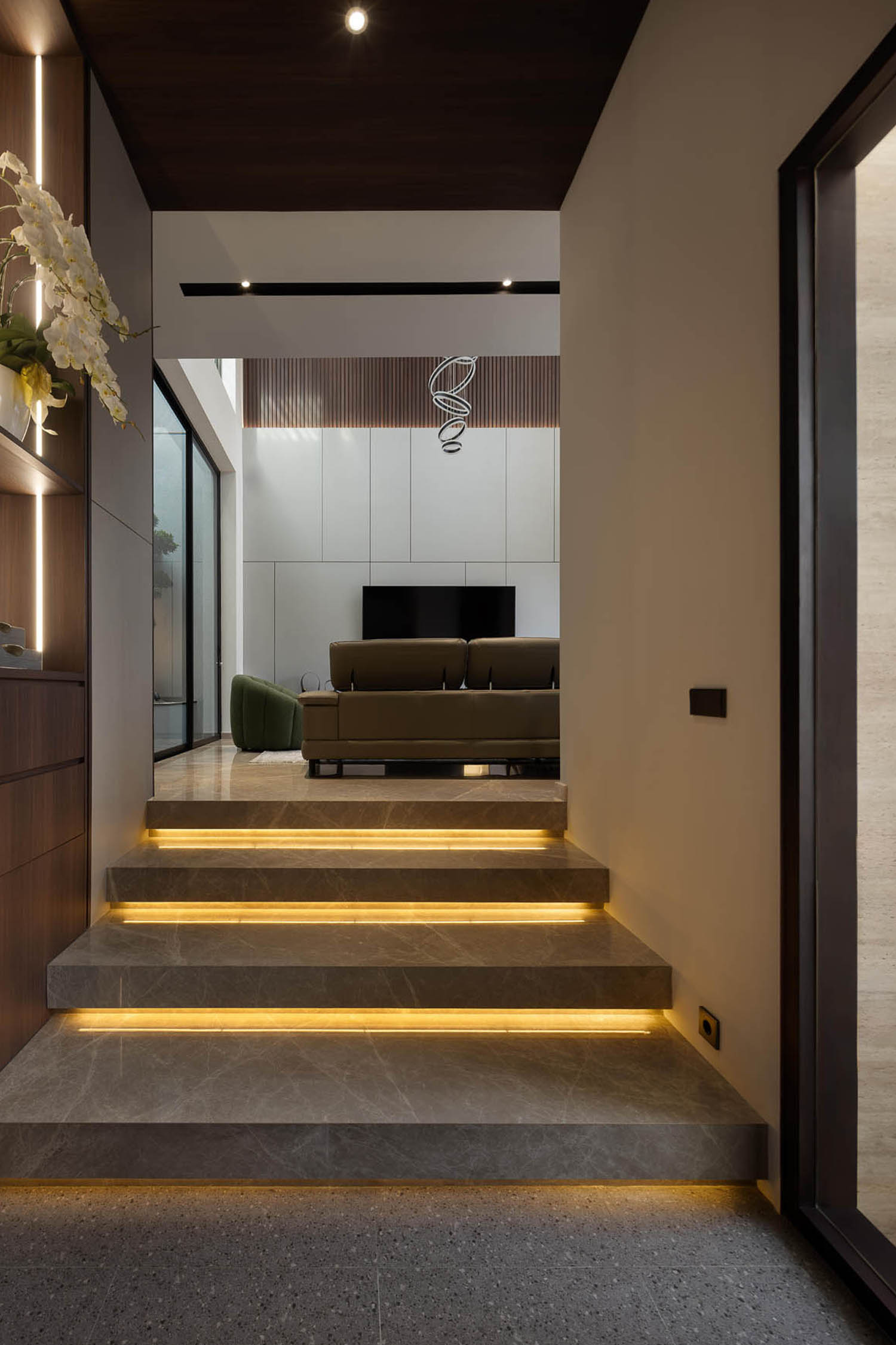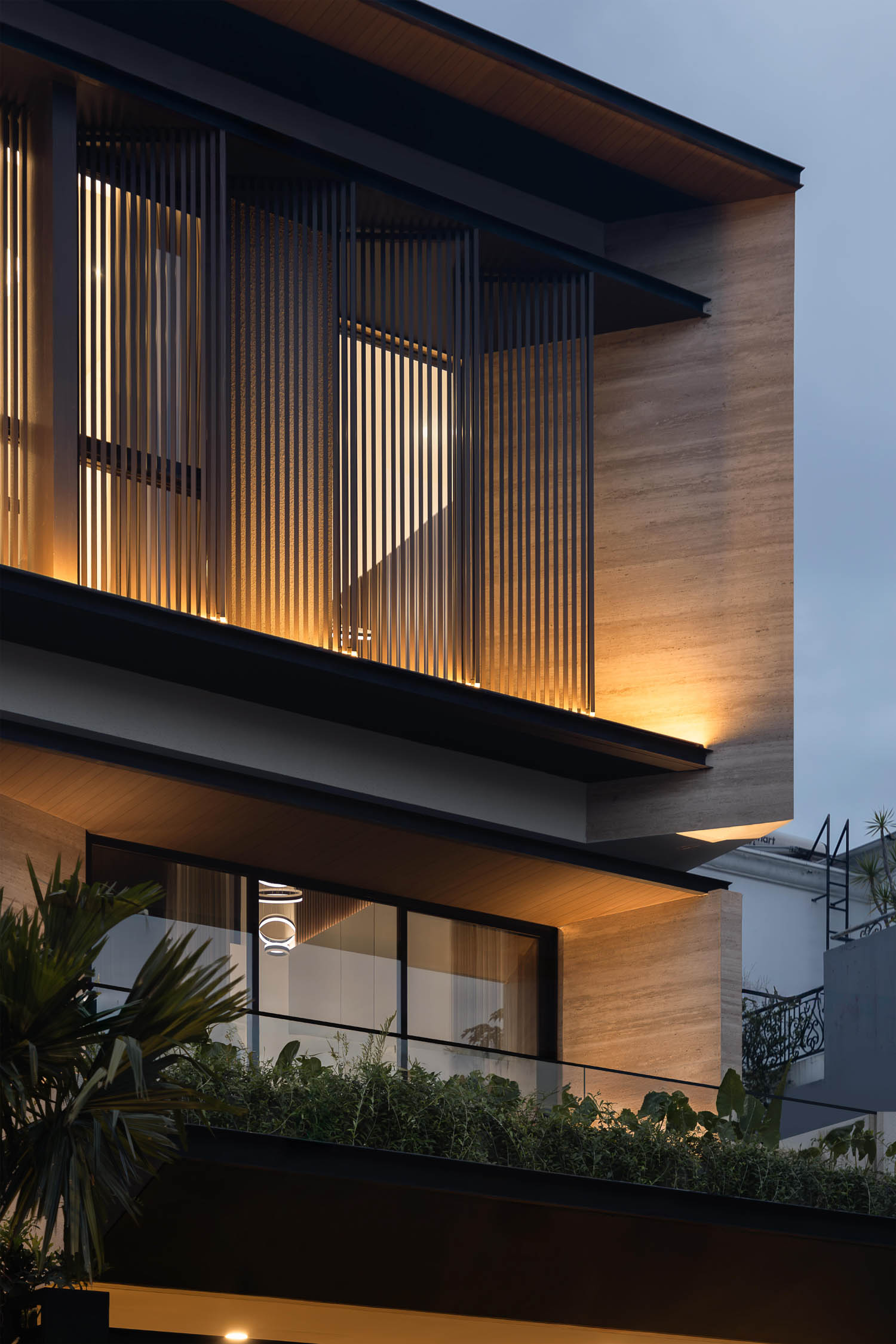 Emphasizing a modern tropical design, this house incorporates natural materials such as travertine marble, wood, and concrete. The façade features a sloping travertine frame, complemented by a spacious canopy and wooden lattice for effective shading.