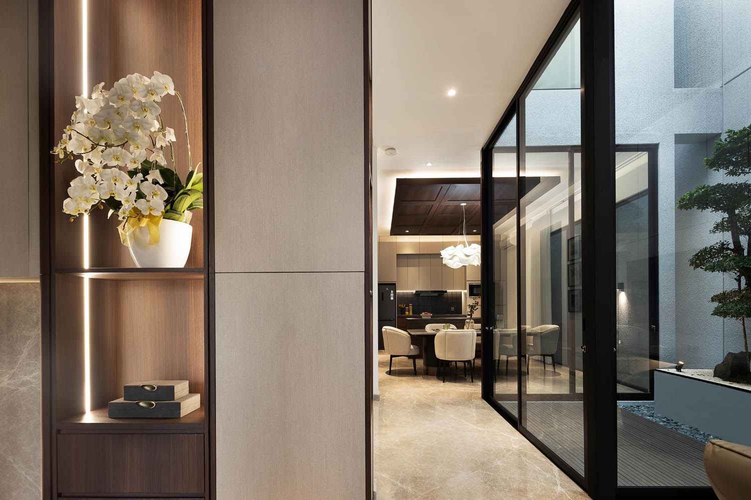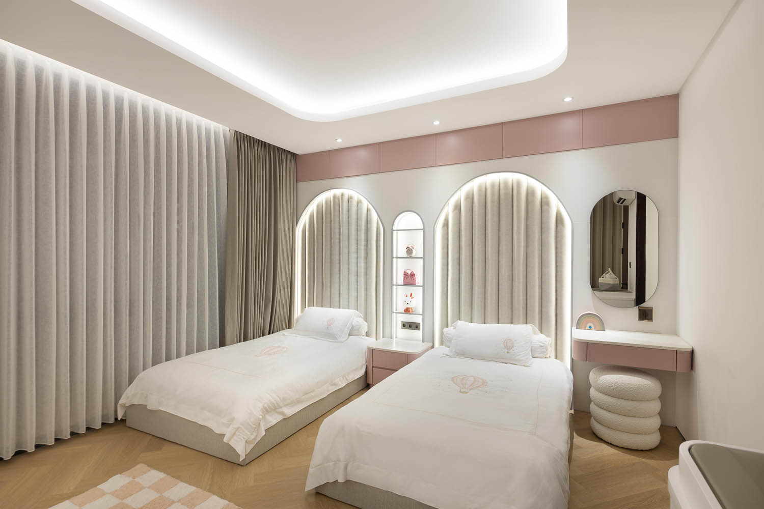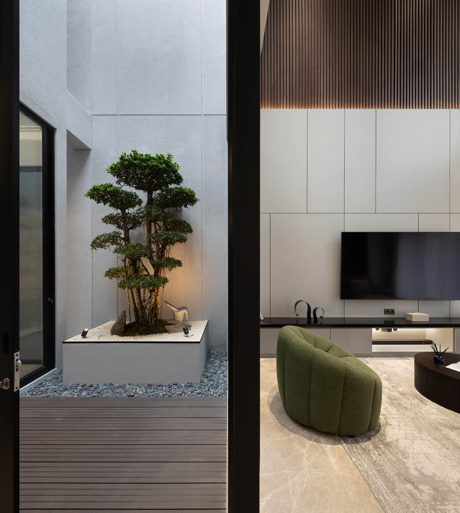 A central inner courtyard, positioned between the living and dining areas, serves as a focal point, bringing freshness and a natural ambiance to the home. The double-height living room, located between the inner courtyard and the balcony, exudes spaciousness while ensuring optimal lighting and ventilation, seamlessly blending with the outdoor area. The abundance of greenery featured throughout the façade, entrance, balcony, and inner courtyard enhances the overall vitality of the home. Moreover, the incorporation of curved elements in the interior details lends a dynamic quality to the spaces, while the choice of materials fosters a neutral and natural atmosphere.