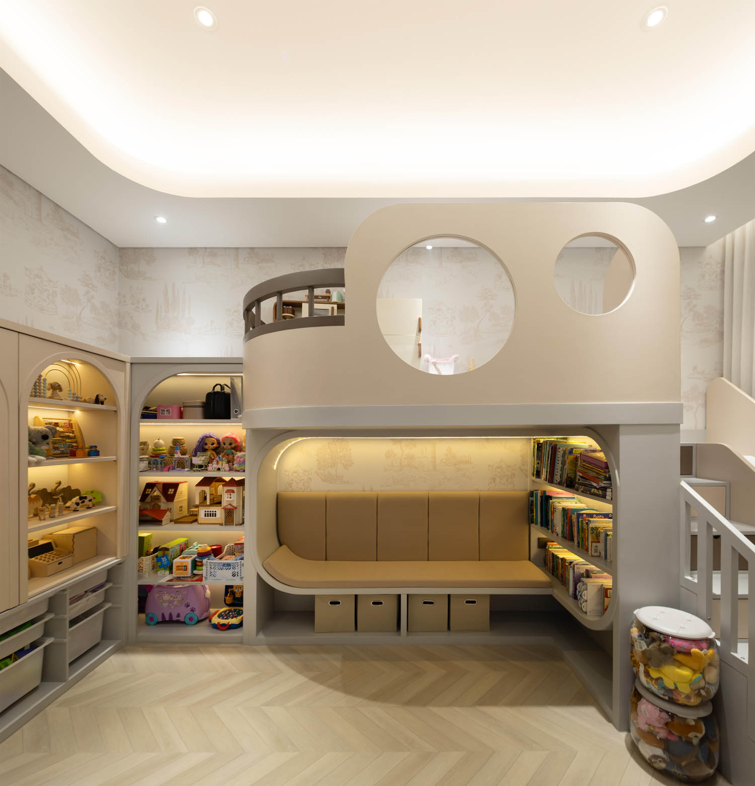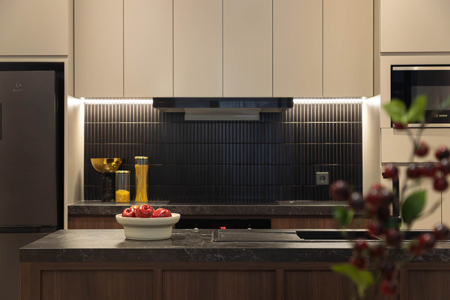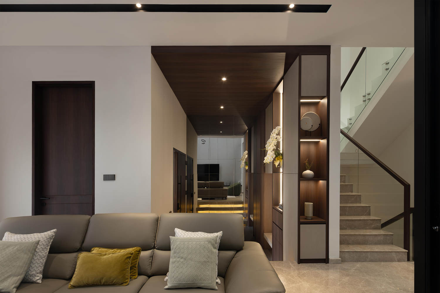 A central inner courtyard, positioned between the living and dining areas, serves as a focal point, bringing freshness and a natural ambiance to the home. The double-height living room, located between the inner courtyard and the balcony, exudes spaciousness while ensuring optimal lighting and ventilation, seamlessly blending with the outdoor area. The abundance of greenery featured throughout the façade, entrance, balcony, and inner courtyard enhances the overall vitality of the home. Moreover, the incorporation of curved elements in the interior details lends a dynamic quality to the spaces, while the choice of materials fosters a neutral and natural atmosphere.