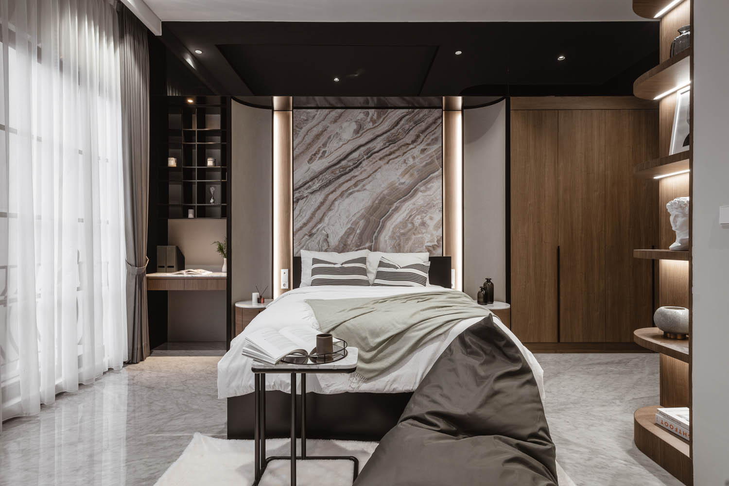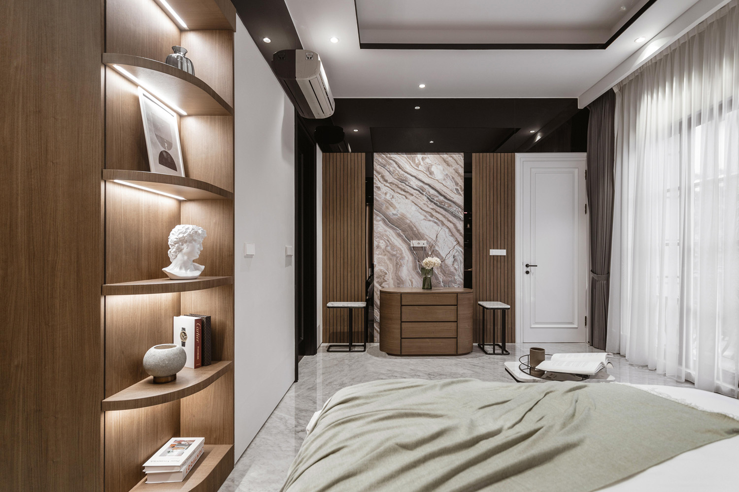 The use of arc as space framing in several areas to create vista in the house. All the curves elements are in the right place, as seen in some sections of bedroom, creating a warm and refined ambiance