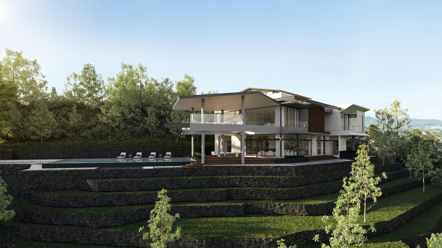 on the hill, the site has the most premium view. To the north it has an undistracted vitoward mountain range, so the main idea is to locate all main, living areas and bedroom toward northern part of the site.